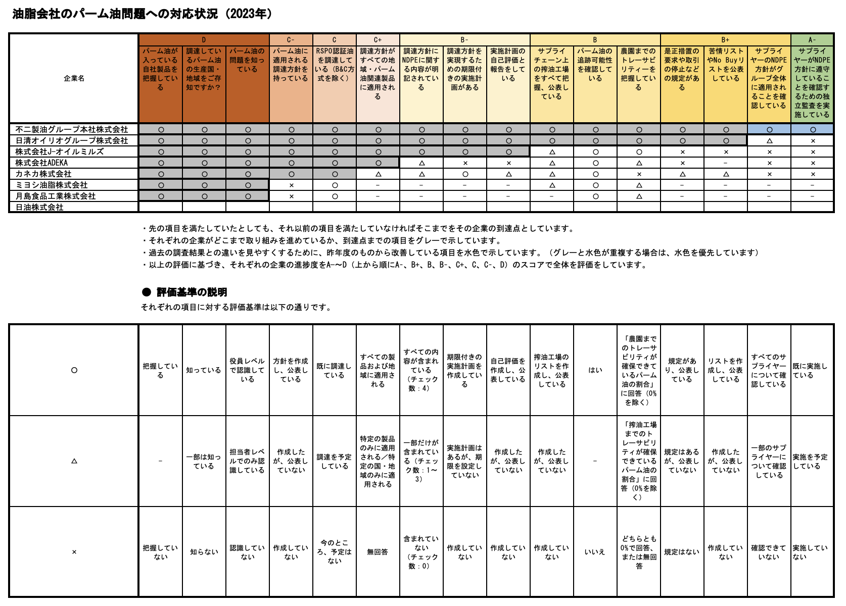 油脂会社の対応状況は?(2023年) 油脂会社のパーム油問題への対応状況 アンケート回答せず: 日油 それぞれの企業の進捗状況や評価項目の詳細は以下の通りです。 過去の対応状況はこちら(2018年、2019年、2020年、2021年、2022年) Tweet